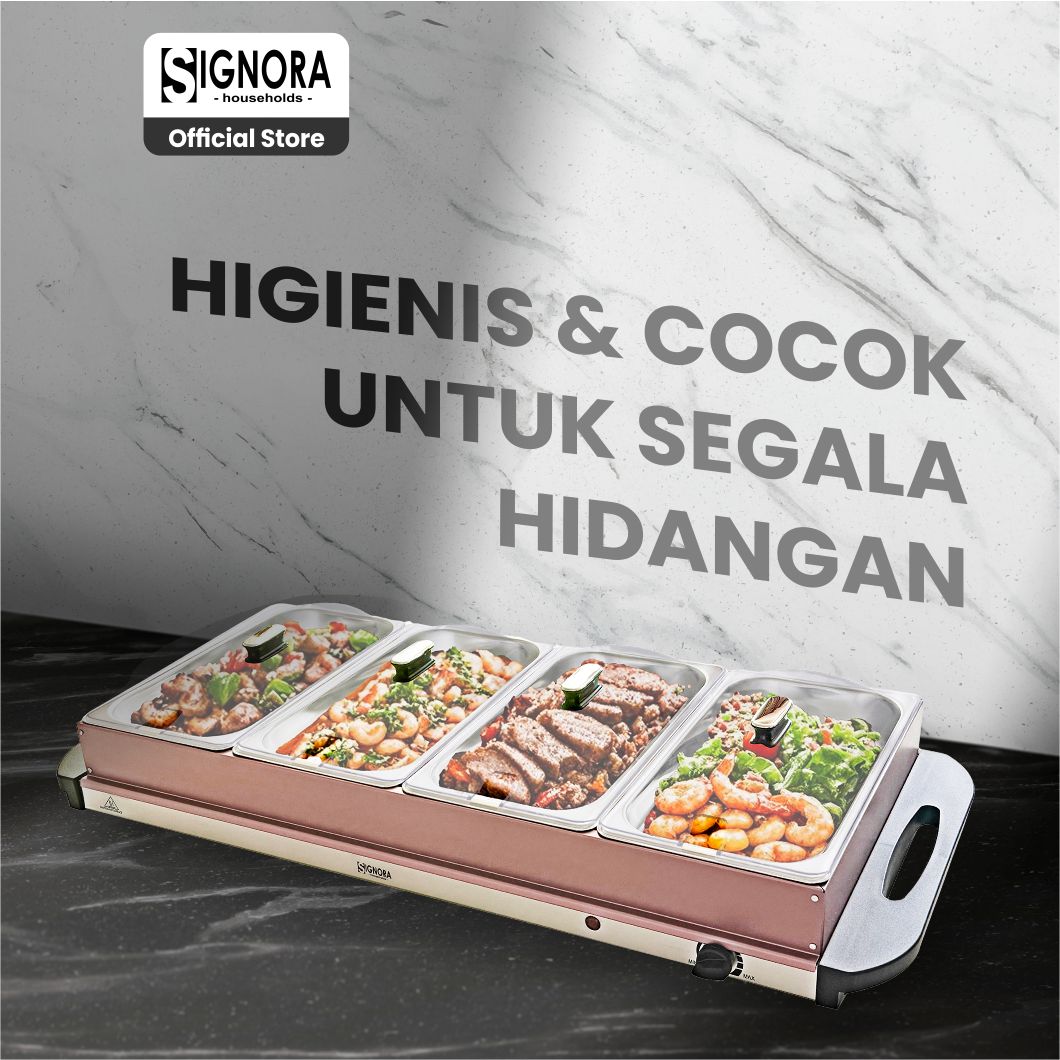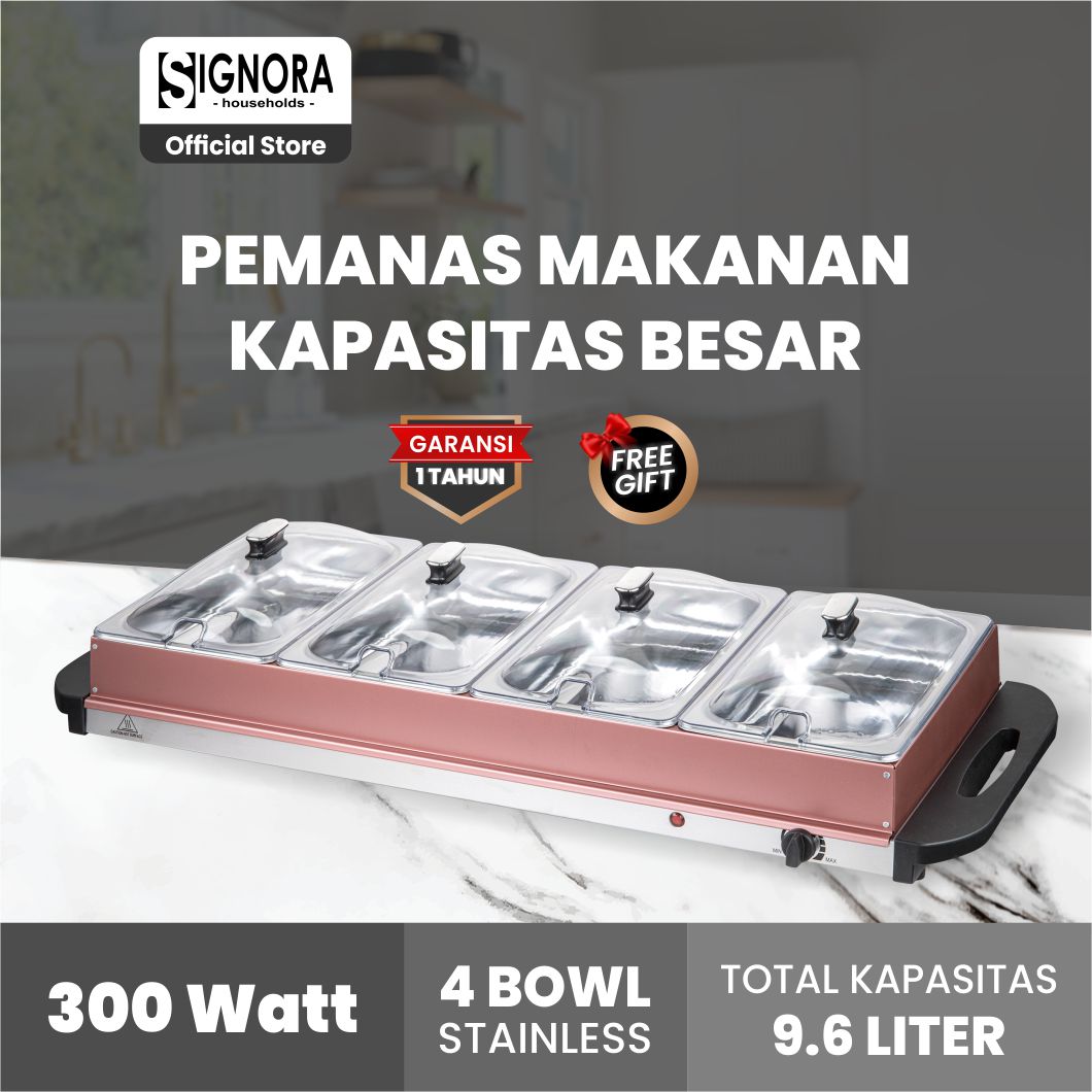 Buffet Server 4 Bowl ini hadir untuk menyajikan dan menjaga kehangatan makanan dengan tampilan elegan dan fungsi maksimal. Terbuat dari bahan stainless steel 304 yang kokoh dengan sentuhan warna rosegold mewah, alat ini dilengkapi 4 wadah terpisah berkapasitas 2,4 liter lengkap dengan tutup transparan untuk menjaga kebersihan dan tampilan hidangan.