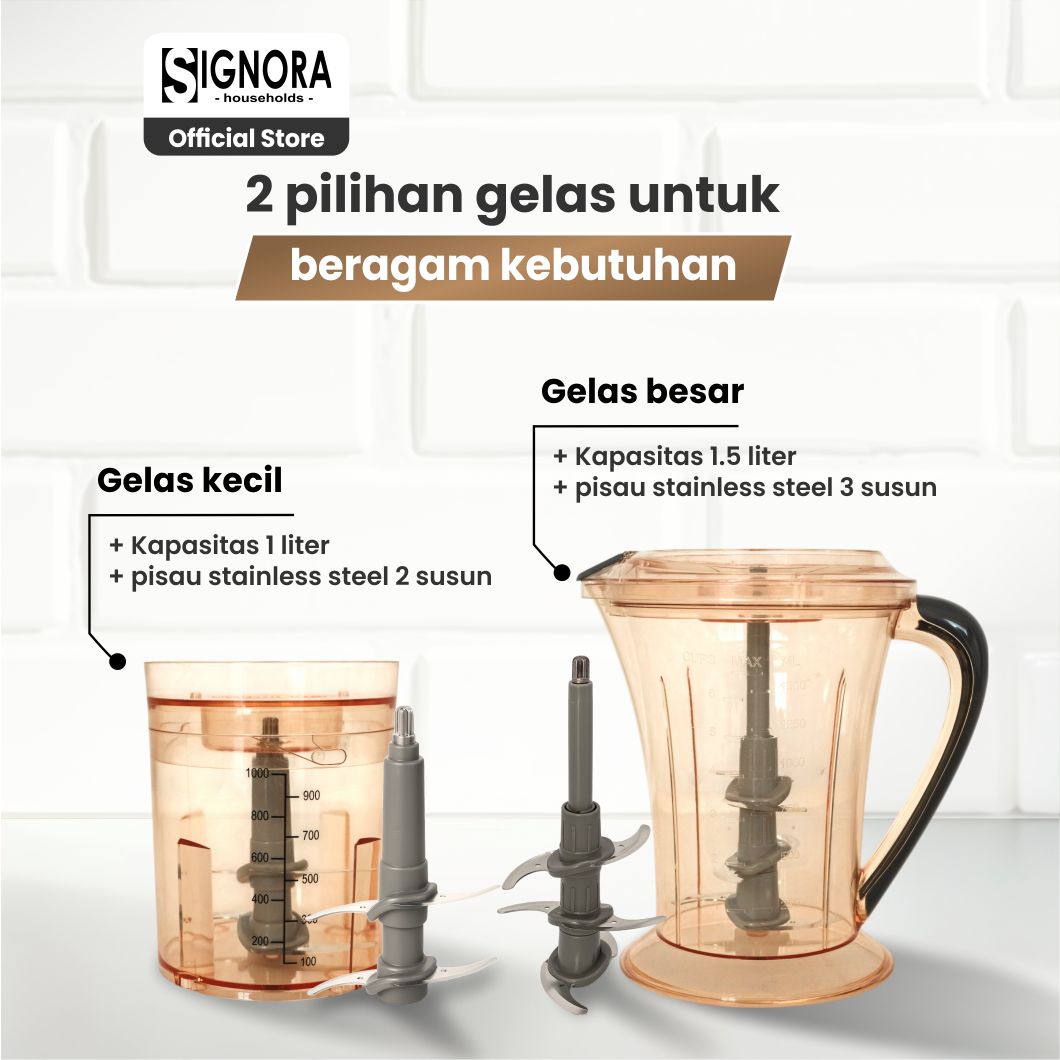 | 2 pilihan pisau dan gelas | Tersedia gelas besar kapasitas 2 liter dan gelas kecil kapasitas 1 liter. Dilengkapi dengan 2 set pisau stainless steel food grade dengan 3 susun dan 2 susun, yang dapat dilepas untuk dibersihkan dengan mudah |