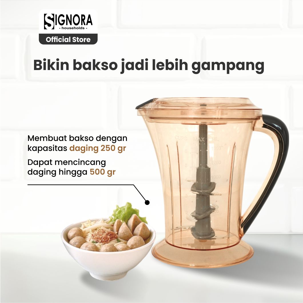 | Kapasitas mencincang | Dapat membuat bakso dengan kamposisi daging 250 gr dan mencincang daging hingga 500 gr |