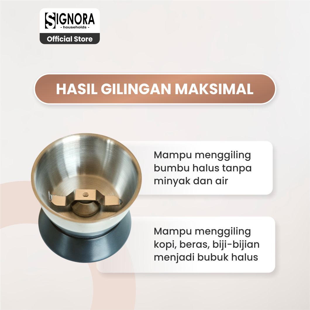 Selain bumbu, grinder ini juga dapat digunakan untuk menggiling biji kopi, beras, hingga kacang menjadi bubuk halus dengan mudah. Materialnya yang tahan lama serta anti noda berwarna membuatnya praktis digunakan sekaligus mudah dirawat.