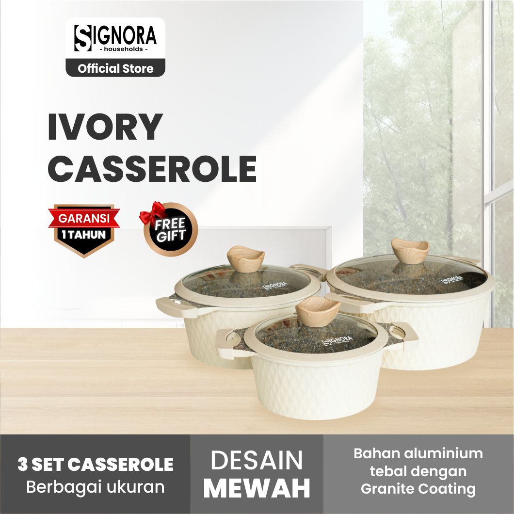 Ivory Casserole Set hadir dengan desain minimalis dan warna ivory yang menawan, set casserole ini bukan hanya cantik dipandang, tapi juga tangguh digunakan. Dibuat dari diecast aluminium berkualitas tinggi dan dilapisi granite coating yang tahan lama, Ivory Casserole Set memberikan pengalaman memasak yang anti lengket dan mudah dibersihkan.