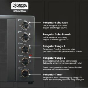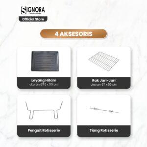 Untuk mempermudah pengaturan, terdapat tombol pada samping oven untuk mengatur suhu, timer, dan berbagai fungsi oven. Tersedia juga aksesoris untuk menunjang kebutuhan memanggangmu dengan loyang hitam, rak jari-jari, pengait rotisserie, dan tiang rotisserie.
