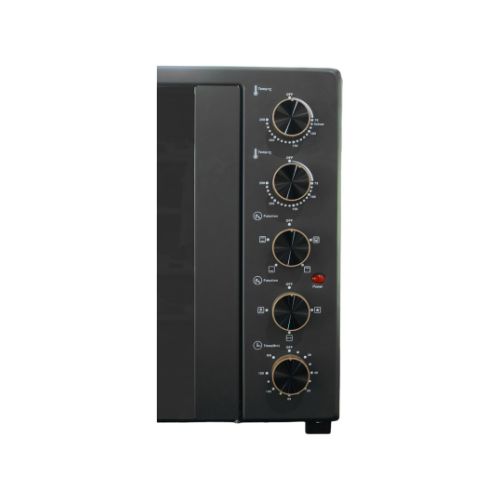 Untuk mempermudah pengaturan, terdapat tombol pada samping oven untuk mengatur suhu, timer, dan berbagai fungsi oven. Tersedia juga aksesoris untuk menunjang kebutuhan memanggangmu dengan loyang hitam, rak jari-jari, pengait rotisserie, dan tiang rotisserie.