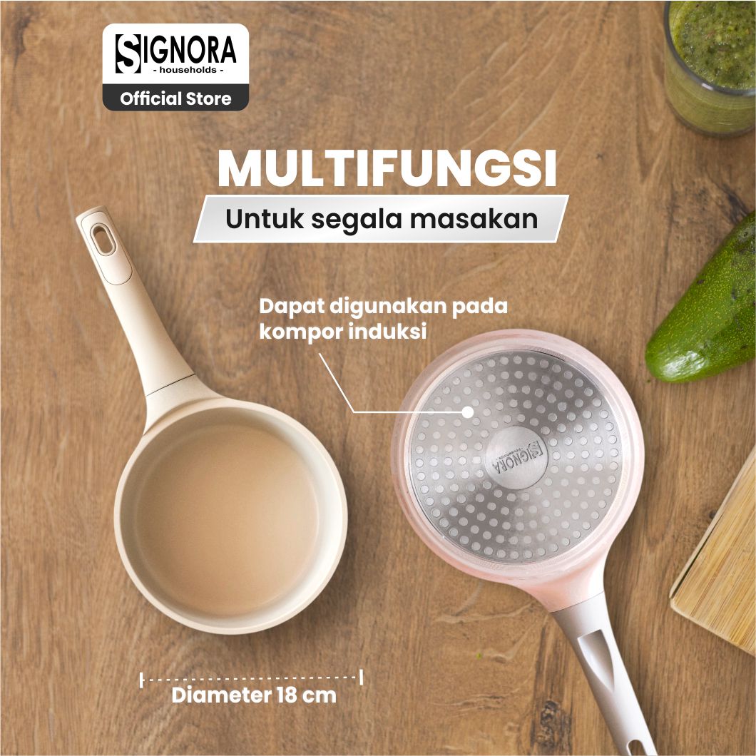 Pink Sauce Pan dari Signora menghadirkan pengalaman memasak lebih praktis dengan wajan cantik ini dilengkapi lapisan anti lengket Greblon® C3 Plus triple layer coating yang bebas PFOA, membuat masakan matang merata tanpa khawatir lengket.