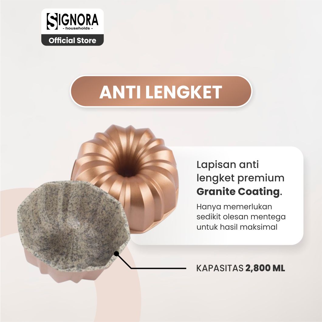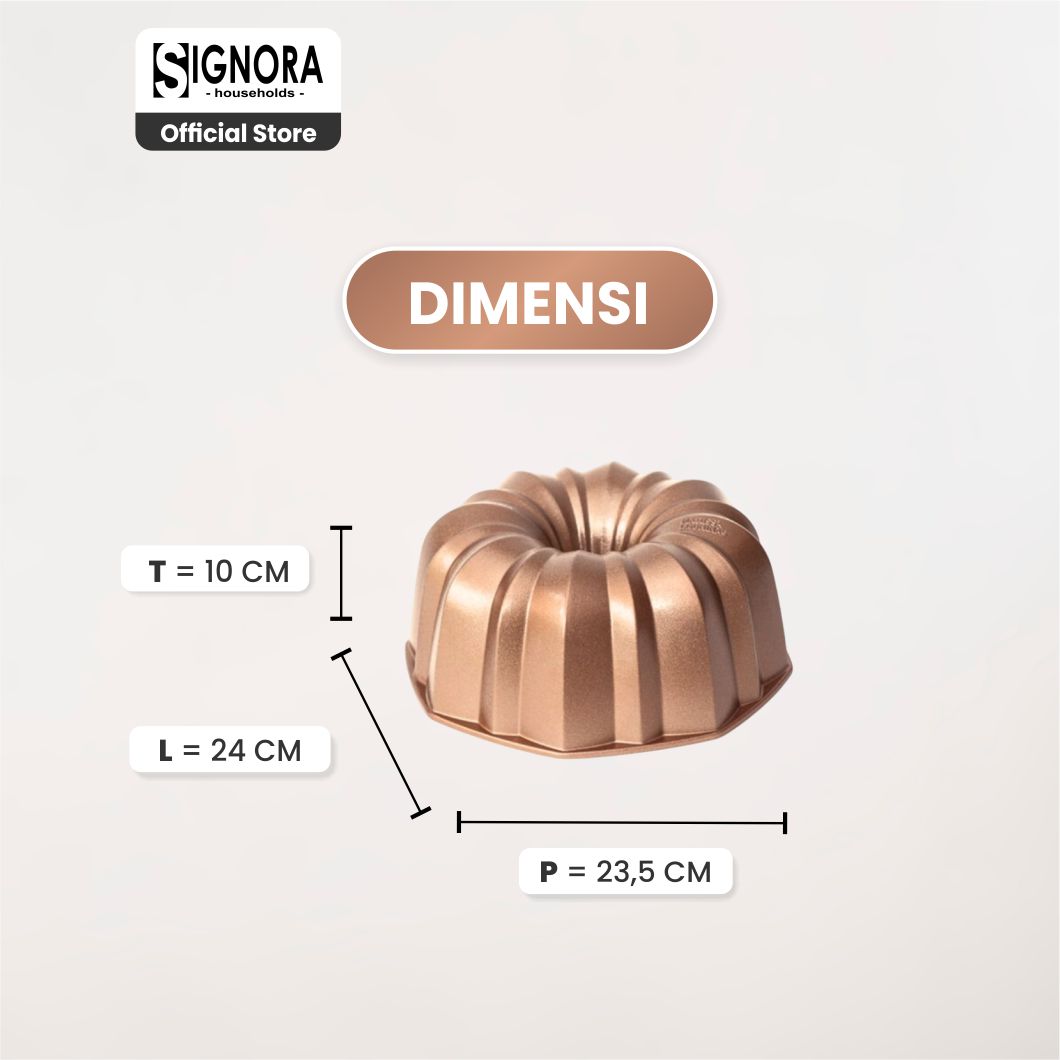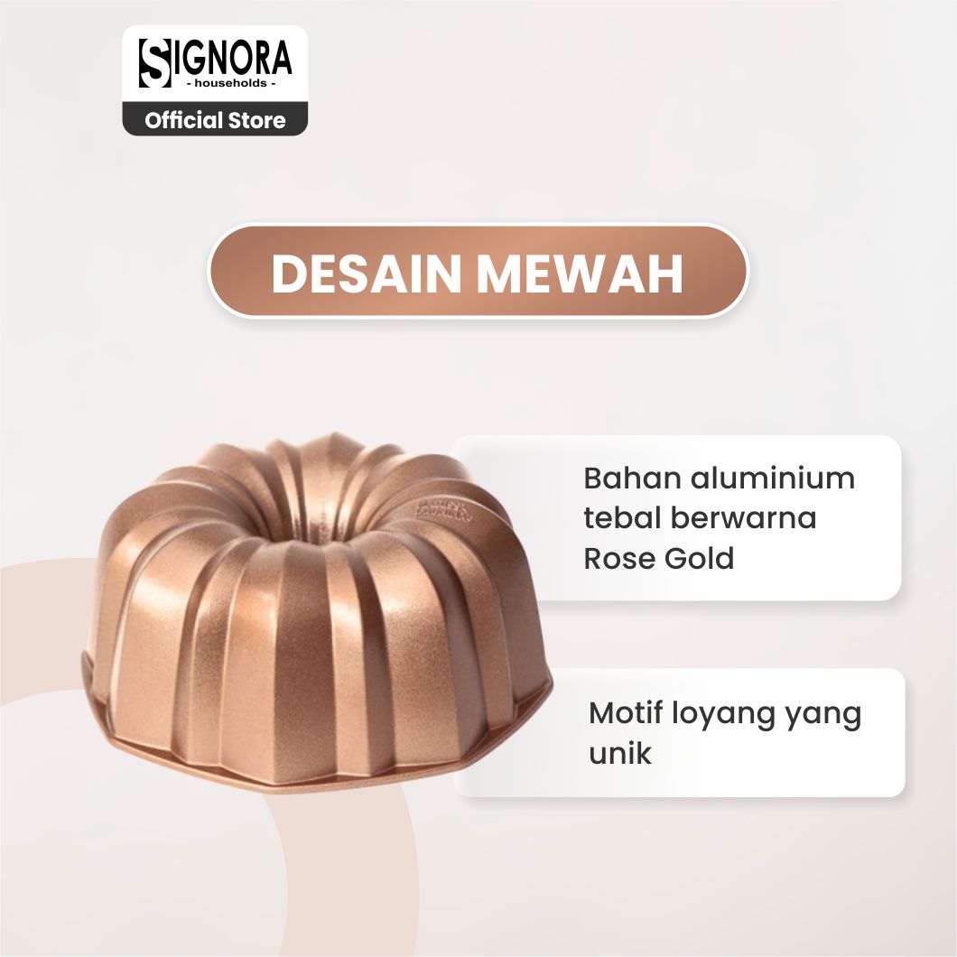 Signora Pan memiliki model elegan dan unik dengan lekukan motif yang tegas sehingga menghasilkan cake yang jauh lebih cantik.