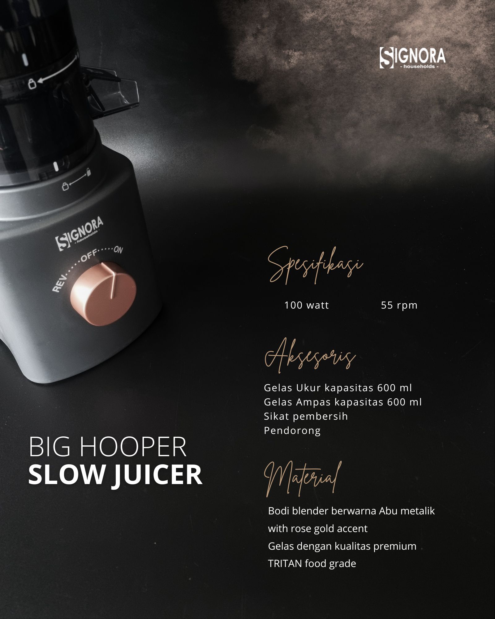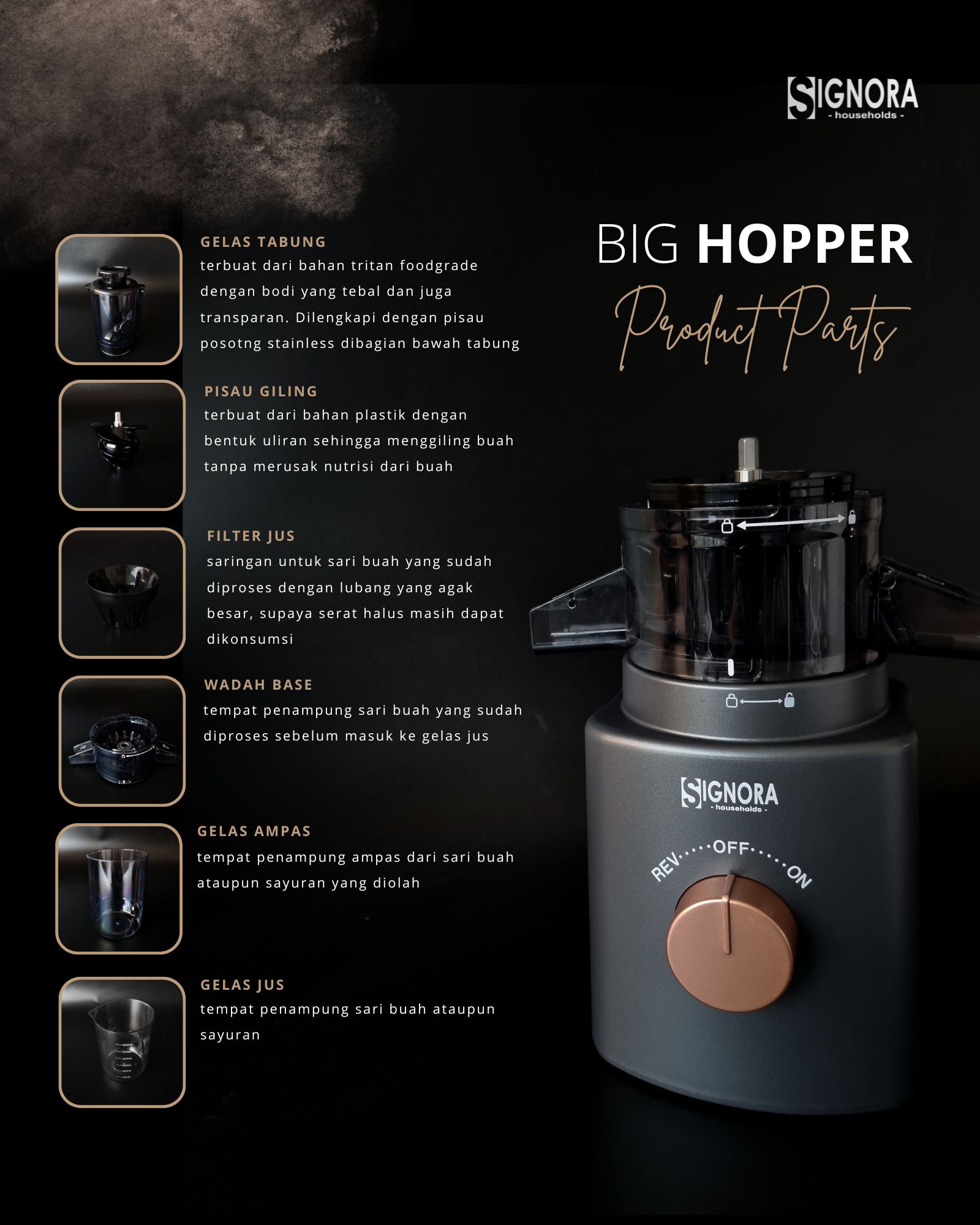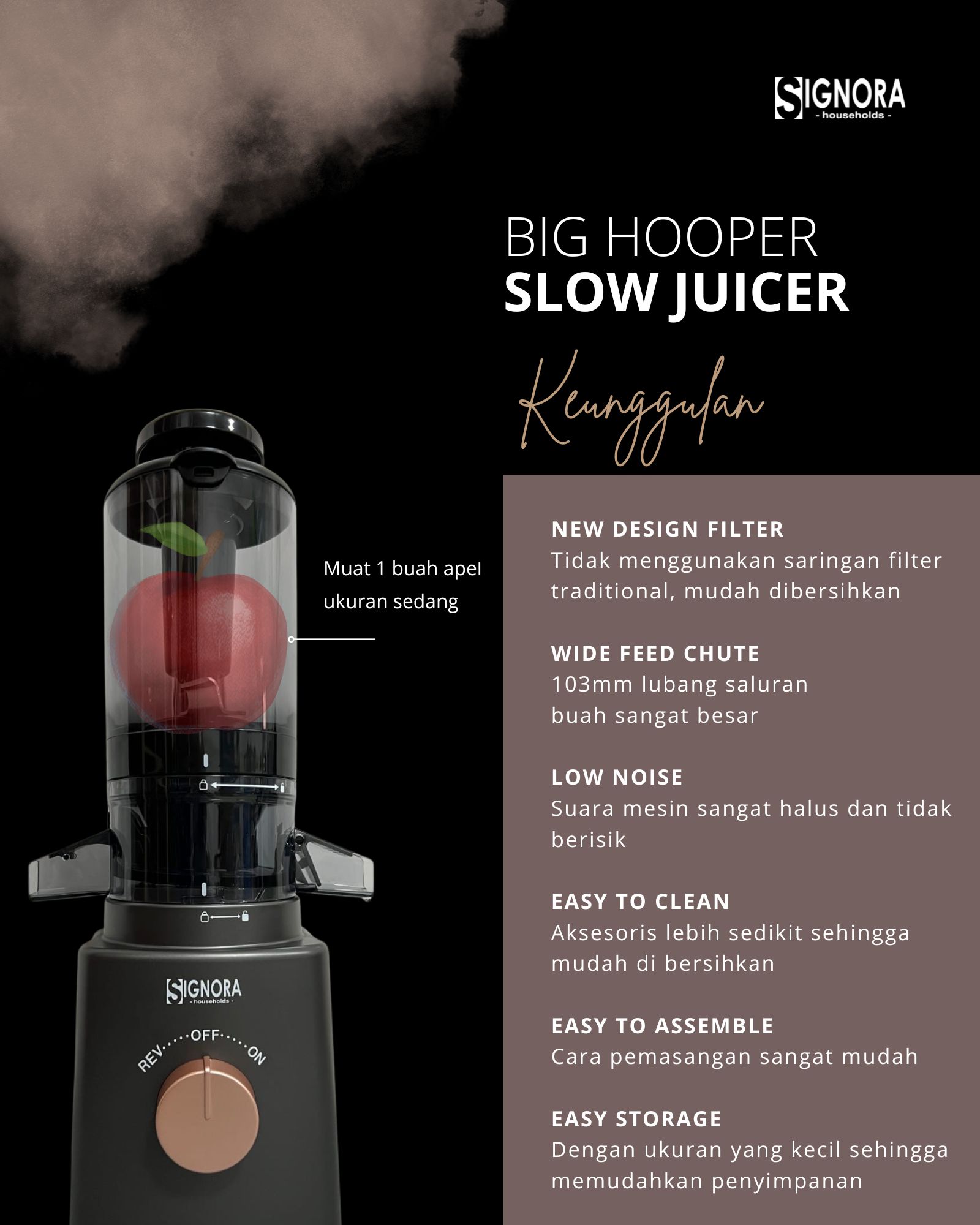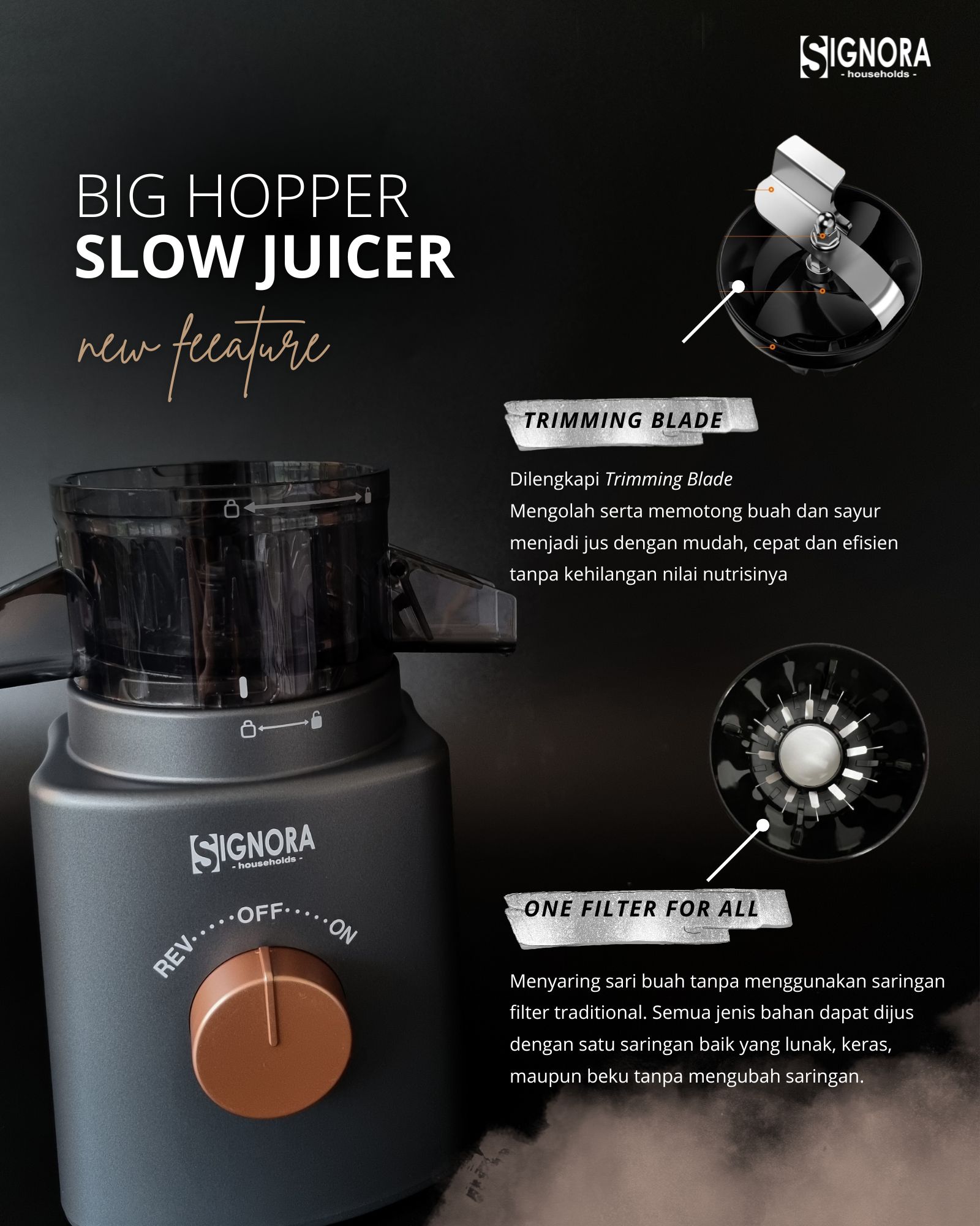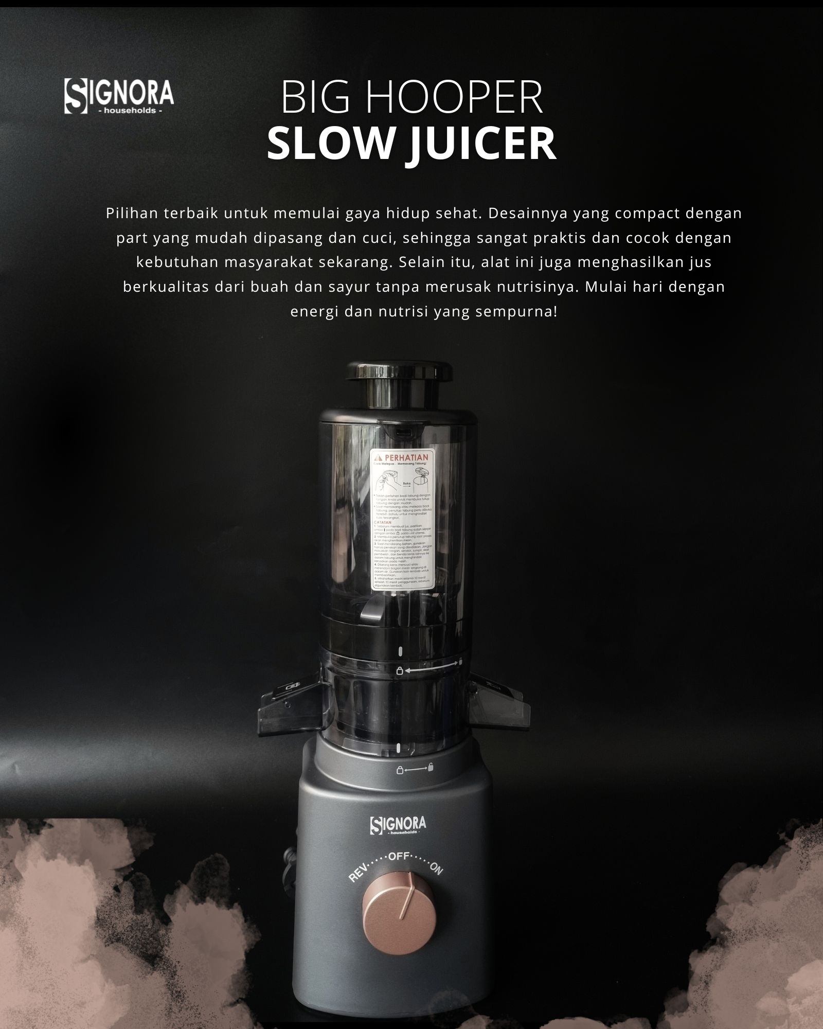Mulai gaya hidup sehat dengan Big Hopper Slow Juicer Signora yang dirancang untuk menjaga nutrisi tetap murni. Berkat hopper-nya yang besar dan pisau pemotong berbahan stainless steel, masukkan buah dan sayur utuh sehingga lebih mudah dalam persiapan ngejus tanpa repot memotong lagi.
