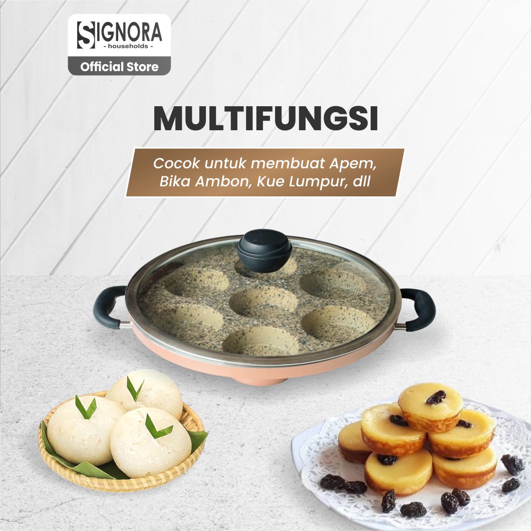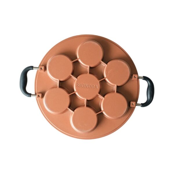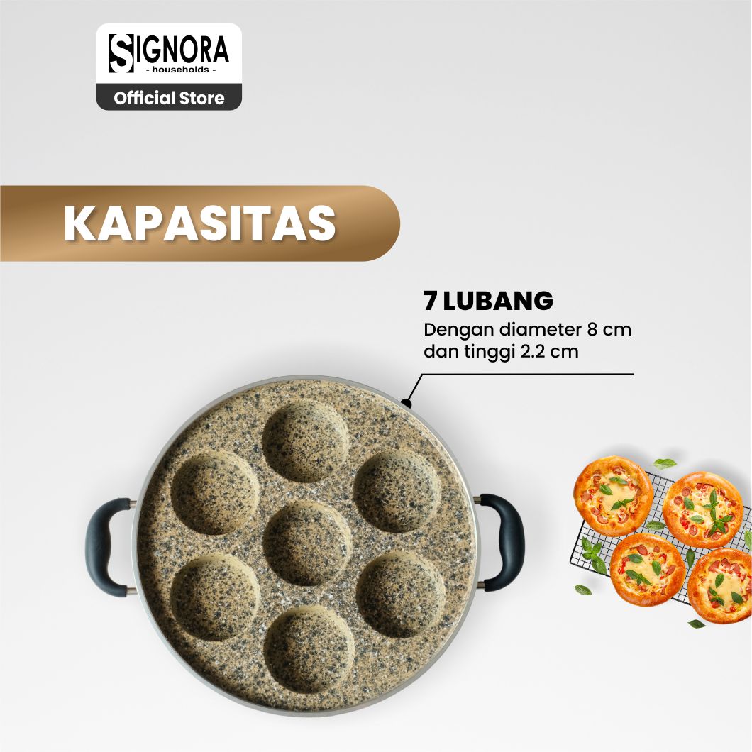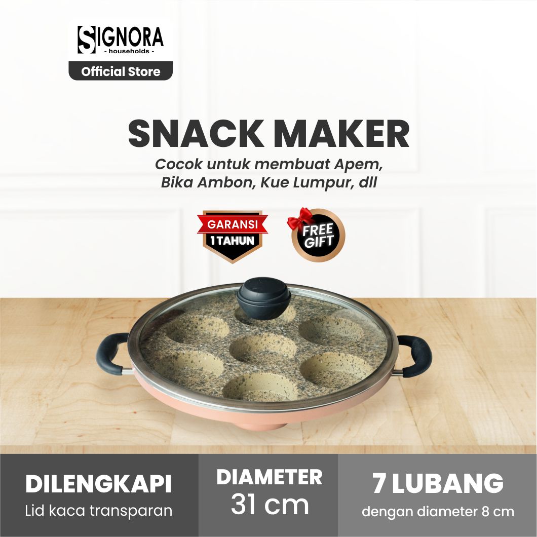 Snack Maker Pan dari Signora terbuat dari bahan dasar material alumunium tebal dengan model bulat yang terdiri dari 7 lubang dan anti karat. Menggunakan Snack Maker Signora membuat pemanasan jauh lebih merata.